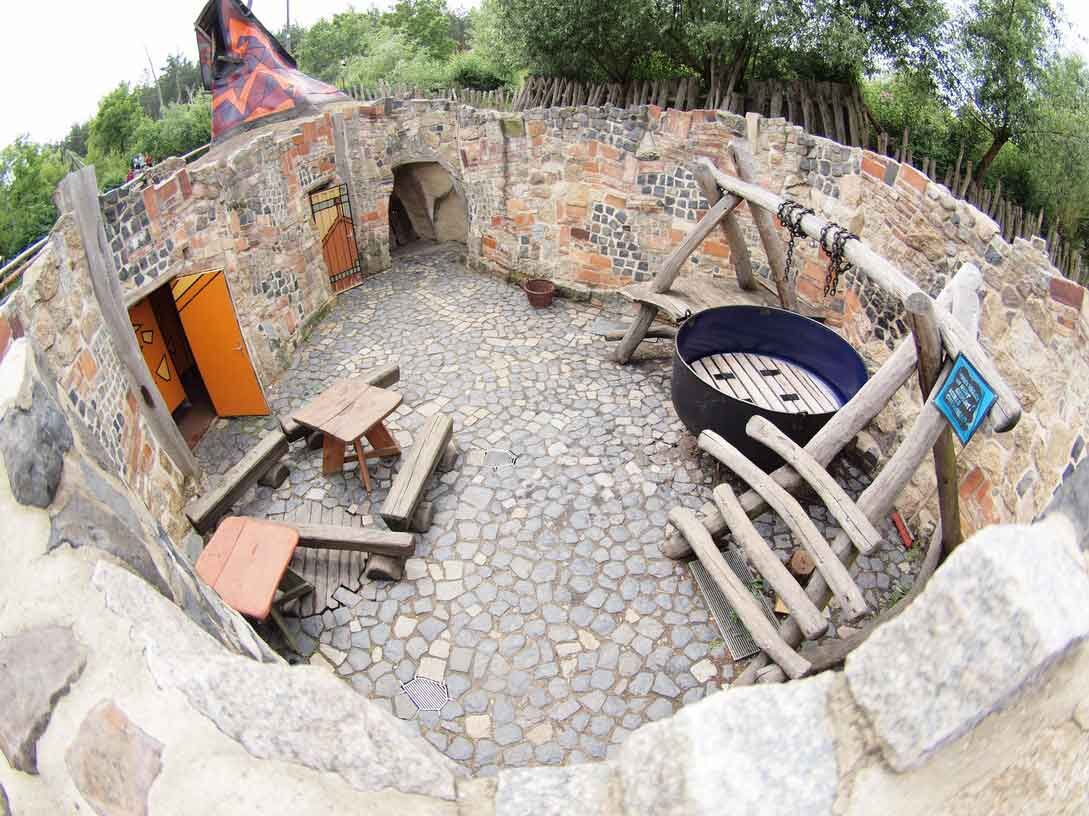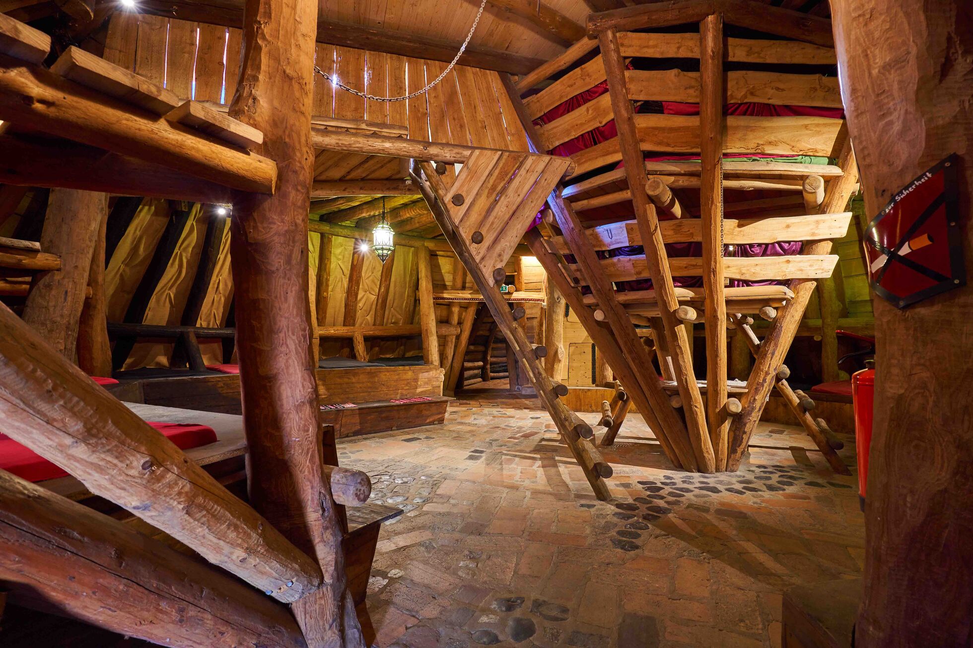 Auch unter der Erde der Kulturinsel kann man an der Matratze horchen. In unserer Schlafhöhle können bis zu 32 Personen Ruhe finden, begleitet vom Schnarcherchor der Haustiere aus aller Welt, welche in der umgebenden „Multikultikoppel“ wohnen. Auf einem Podest das um den ganzen Raum führt, laden Matratzen zum Abgrunzen ein, also denkt an einen Schlafsack für eine wohlige Nacht.Ein letztes Bad im Kannibalenkessel (dieses „einmalige“ Abenteuer ist extra buchbar) schafft ein uriges Ambiente. Vor allem für gestresste Bürohengste und Schreibtischmiezen ist das ruhige Erdhaus eine echte Erholung von Telefonflut und Email - Attacken.