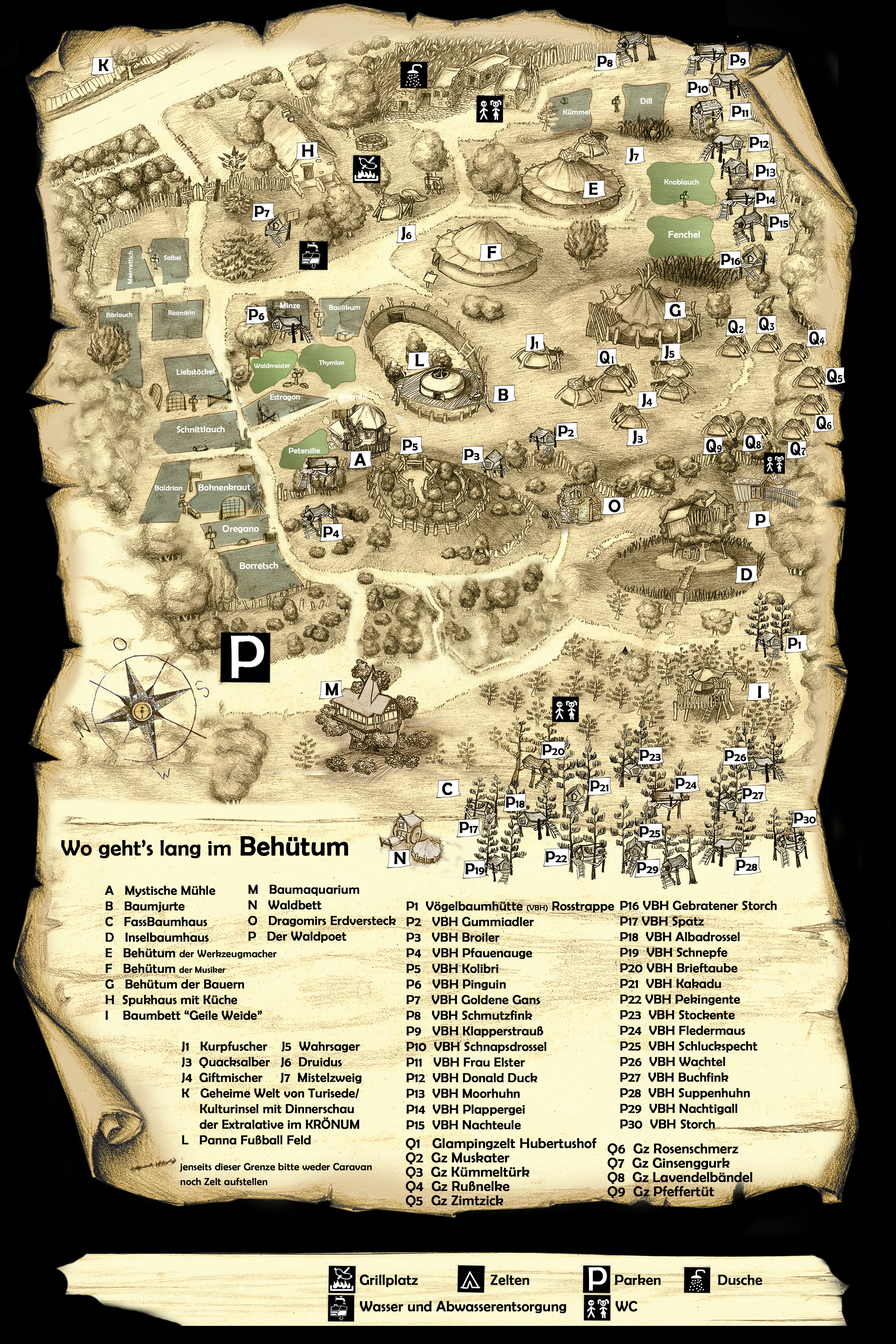3. Stellflächen mit "Kräuternamen" im Behütums-Areal umgeben von unserem Spukhaus, der Ballspielgrupe "Claire" und den Behütummis. Dort gibt es sogar einen Gemeinschaftsraum im Spukhaus für euch. Und gleich nebenan findet ihr die Sanitäranlagen. Beides steht euch jeder Zeit zur freien Verfügung.