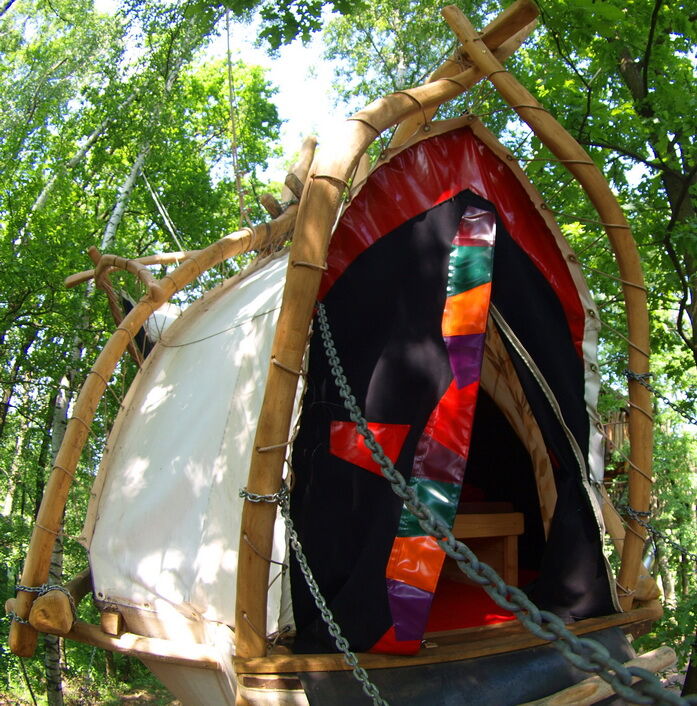 In this unique and cosily furnished roost, the subdued rustling of leaves is sometimes accompanied by flashes of inspiration. Those who take a peep over the rim of the cocoon will gain fantastic insights, until the wind gently lulls cocoon-guests to sleep.