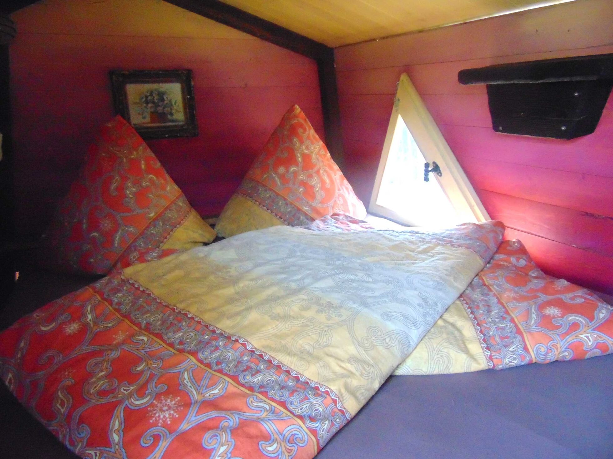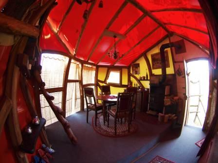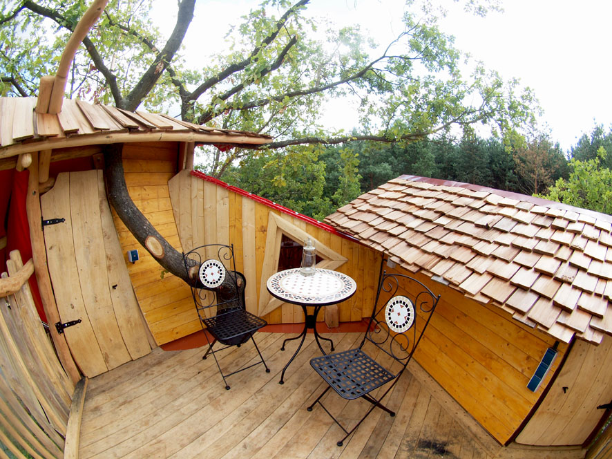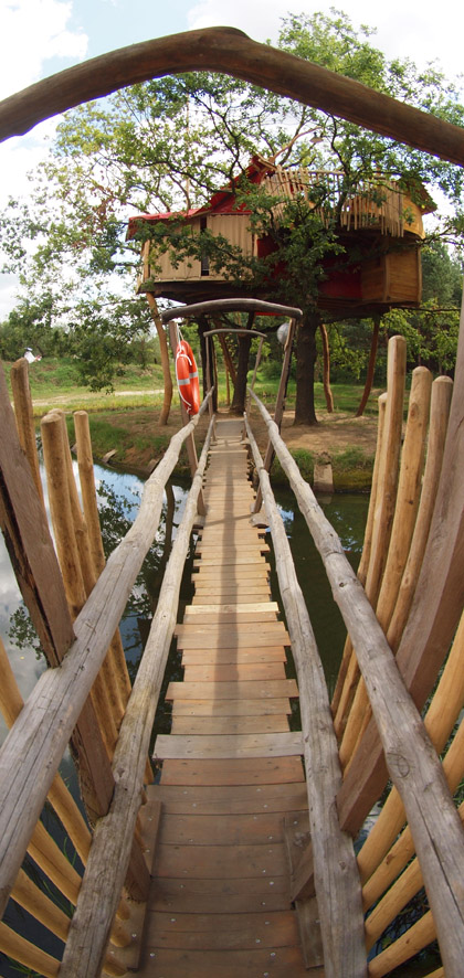 This tree house is situated on the edge of the camping ground "Behütum" in the centre of a pond. Mainly made from tent fabric, it still offers a warm and cosy space with an oven, a canopy bed and a children's lodge on top... a place for true romantics.