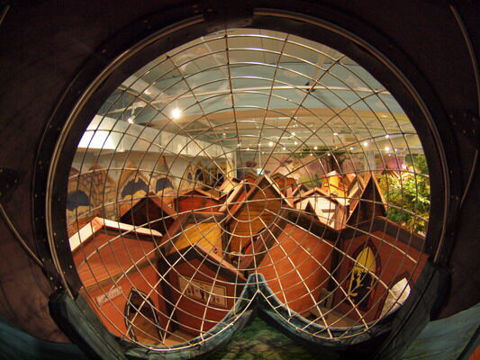 Die Außenwände bestehen aus Gitter, welche den Einblick von beiden Seiten ermöglichen. Von den verrückten Insulanern wird so eine “durchsichtige” Atmosphäre geschaffen.