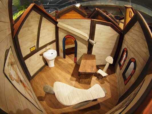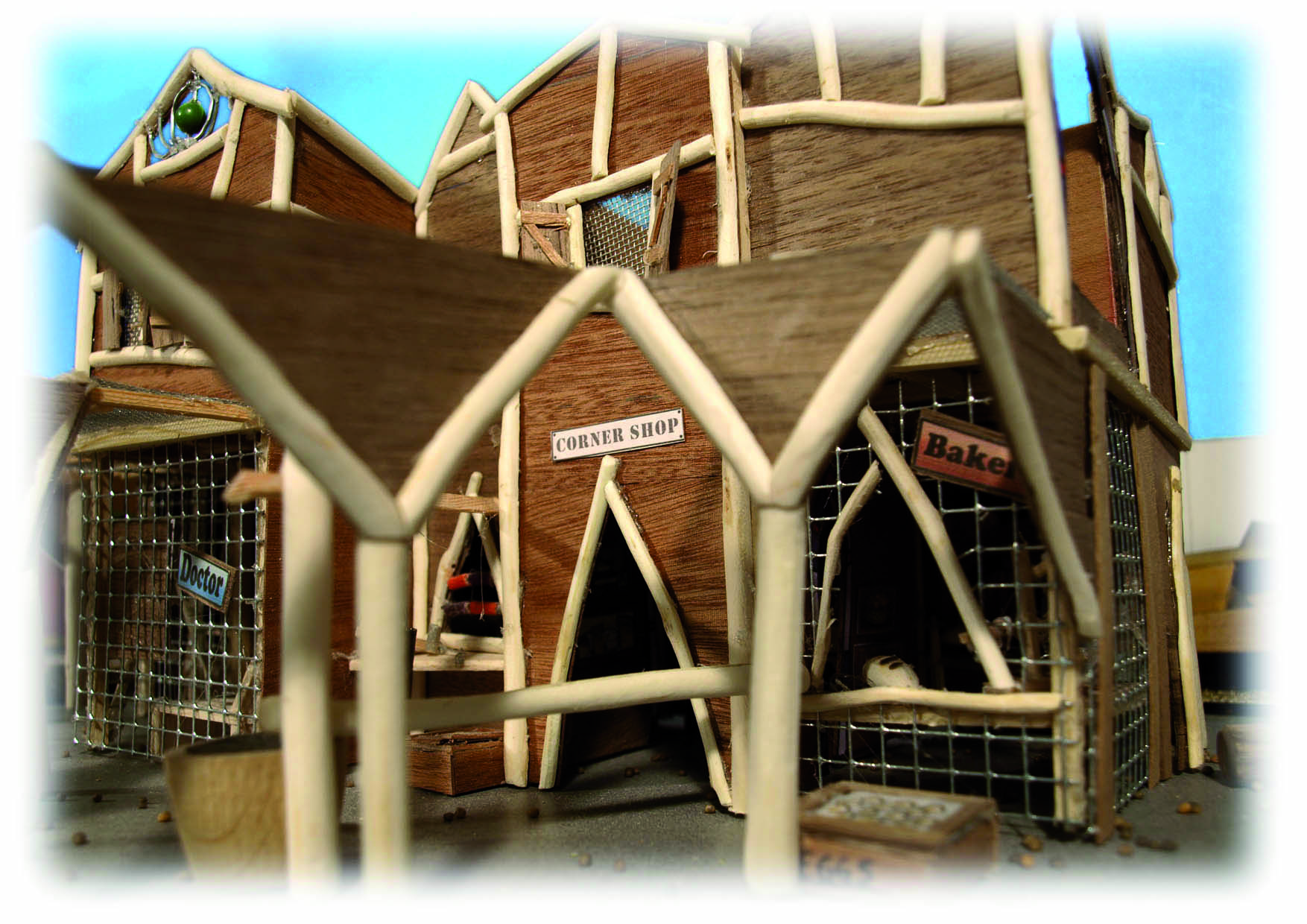 Die “Puppenstuben-Hauszeile” besteht aus vier einzelnen Segmenten mit je zwei Etagen, diese wiederum sind über Durchgänge und Rutschen miteinander verbunden.