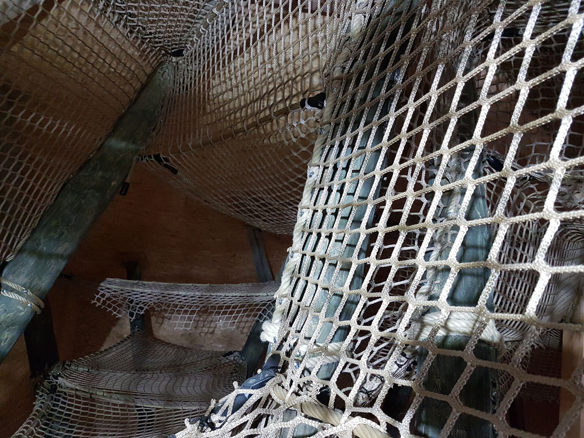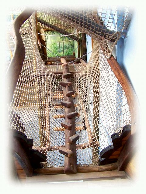 Während sich ebenerdig Straßen kreuzen und die kids auf 4 Rädern durch Häuserschluchten flitzen, gibt es darüber ein kaum erfassbares Wirrwarr aus Netzen, Seilen, Brücken, Stegen und Baumhäuschen… den Kletter-Dschungel!