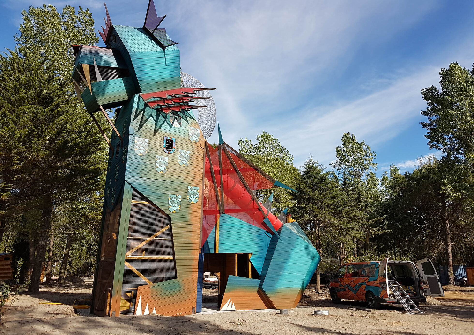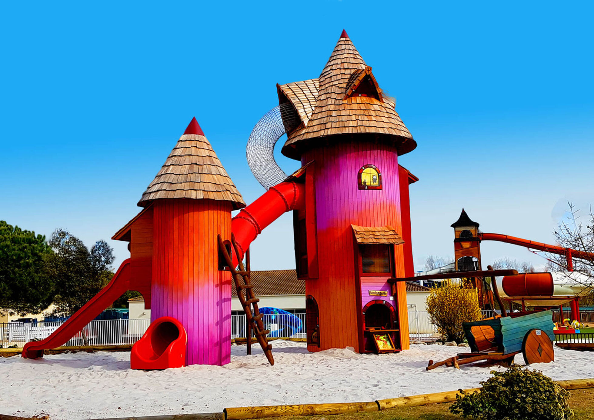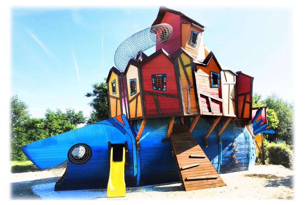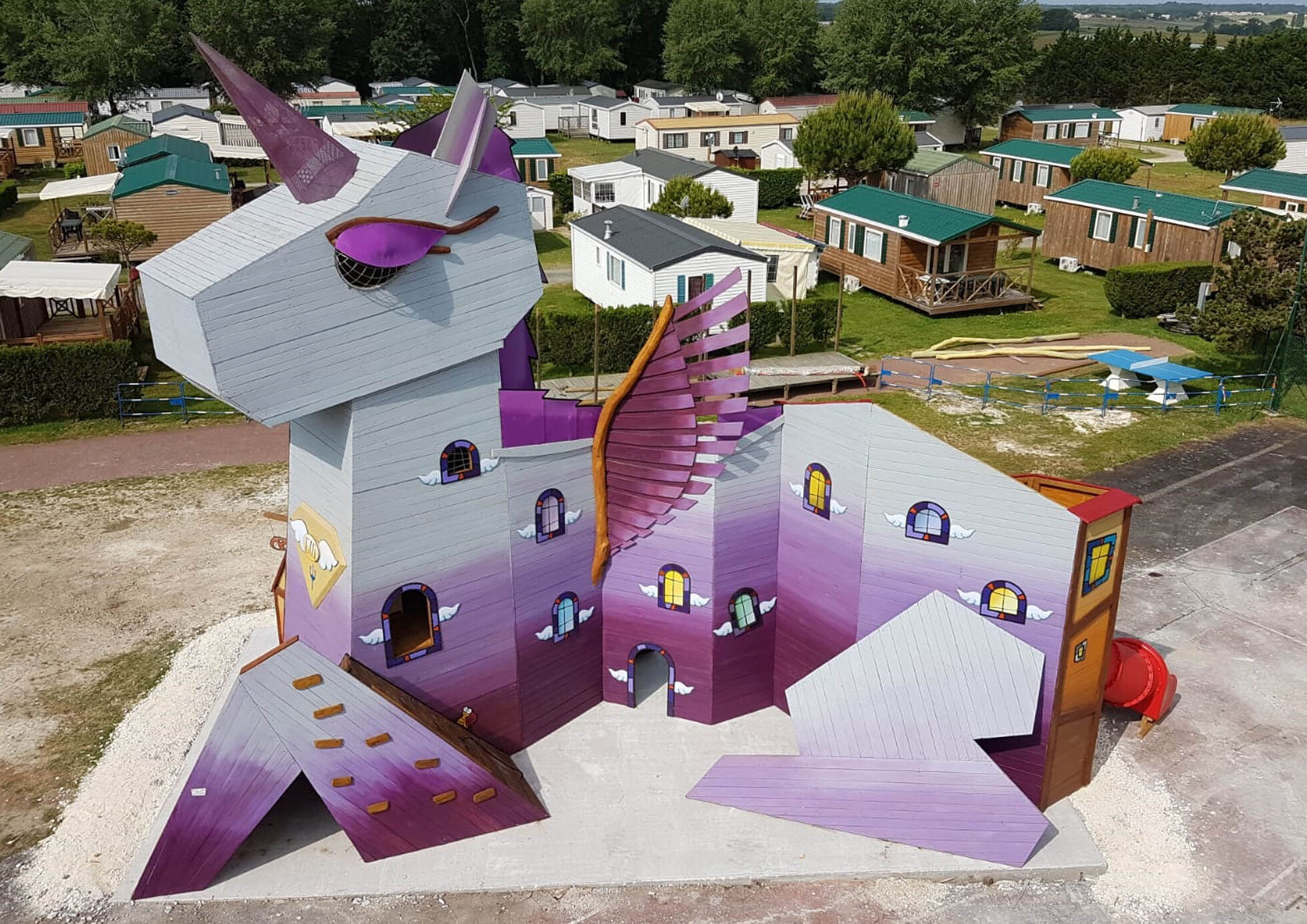 Eine Garantie für spannende Projekte bietet unsere Zusammenarbeit mit dem französischen Ferienpark-Betreiber Capfun. Komplette Spielanlagen stecken hier z.B. im Drachen, Schiff, Schloss oder Einhorn. Dieses ist auch noch doppelsinnig: die eine Seite ein romantisches geflügeltes, bekletterbares Traumwesen – die andere eine bunte Spielstadt mit Rollenspiel und Rutsche.