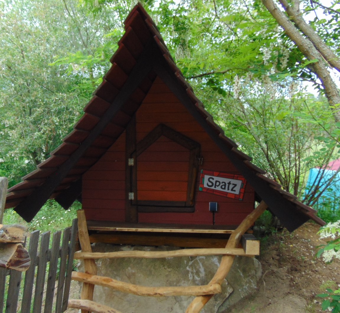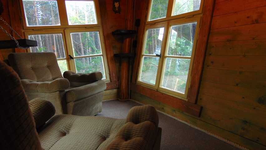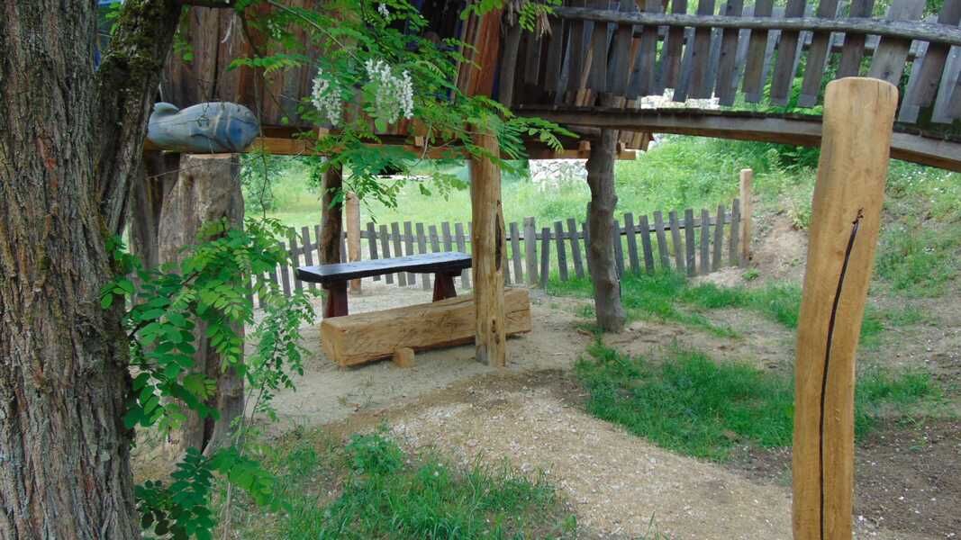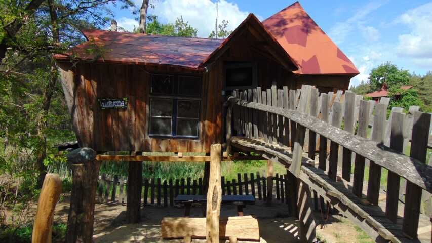 Pod chatką znajduje się zadaszone miejsce do siedzenia z widokiem na zaczarowany krajobraz, w którym dumnie prezentuje się Domek na wyspie i Nadrzewne akwarium.